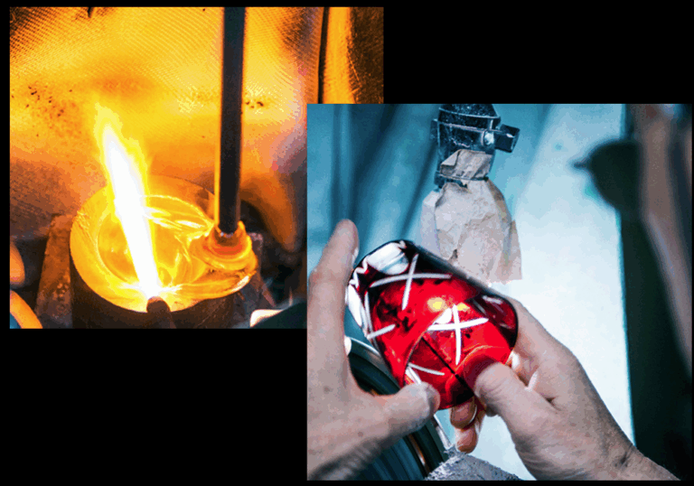 切子とは、砥石等の研磨材を用いて硝子器に彫り込まれたカット模様のことです。この技法は、江戸時代の後期より現代に伝えられてきた伝統工芸のひとつです。 江戸切子は外側に色硝子、内側に透明硝子を重ね合わせた、二層の硝子器にカットすることによって、無色透明のカット面と、色硝子の織りなす色彩のコントラストや、美しい輝きを楽しめるものです。 この硝子器は、職人による手吹き工芸の器に、江戸切子伝承の技法と独自の繊細な技法やデザインを加えた、新しい感覚の硝子工芸品となっています。